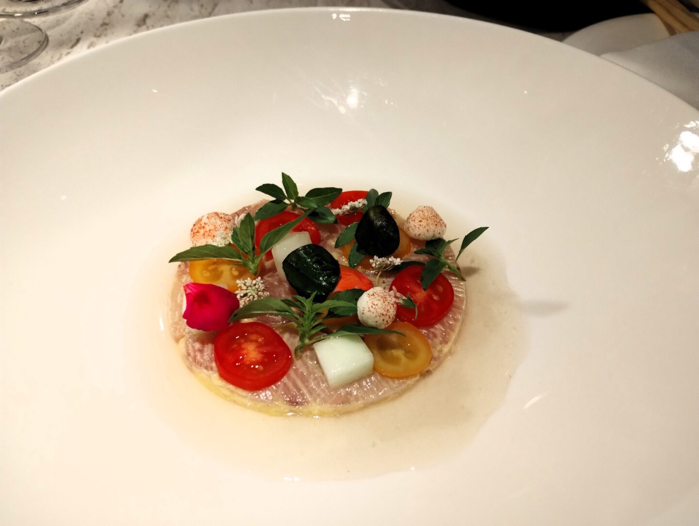 For our first course, we had the ‘Crudo di ricciola’, Amberjack carpaccio served with tomato and cucumber extract. It was incredible, fresh, light and full of wonderful delicate flavours.