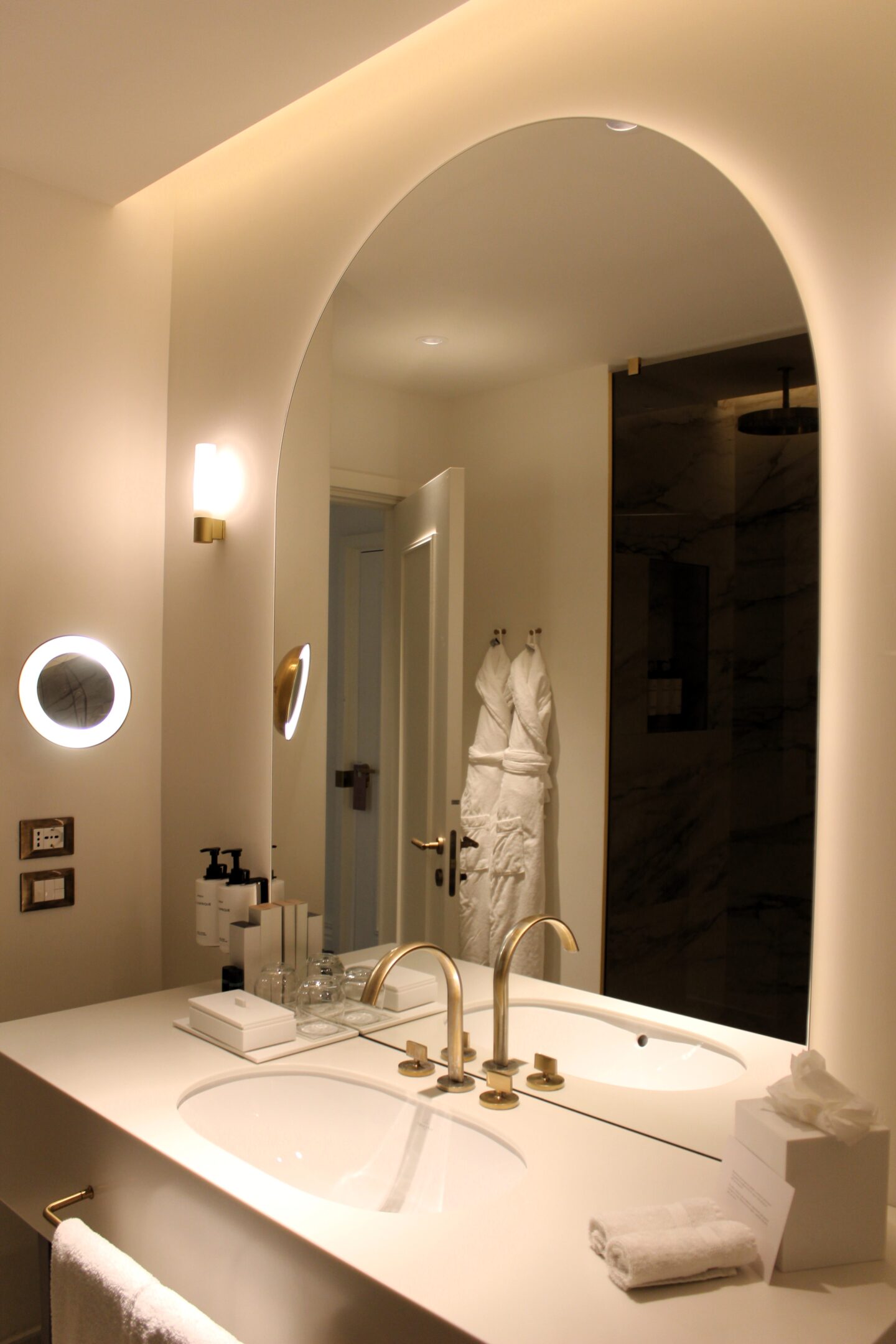 The bathroom, as well as being large in space and having a wonderful waterfall walk-in shower, was beautifully presented in white marble with gold detailing.