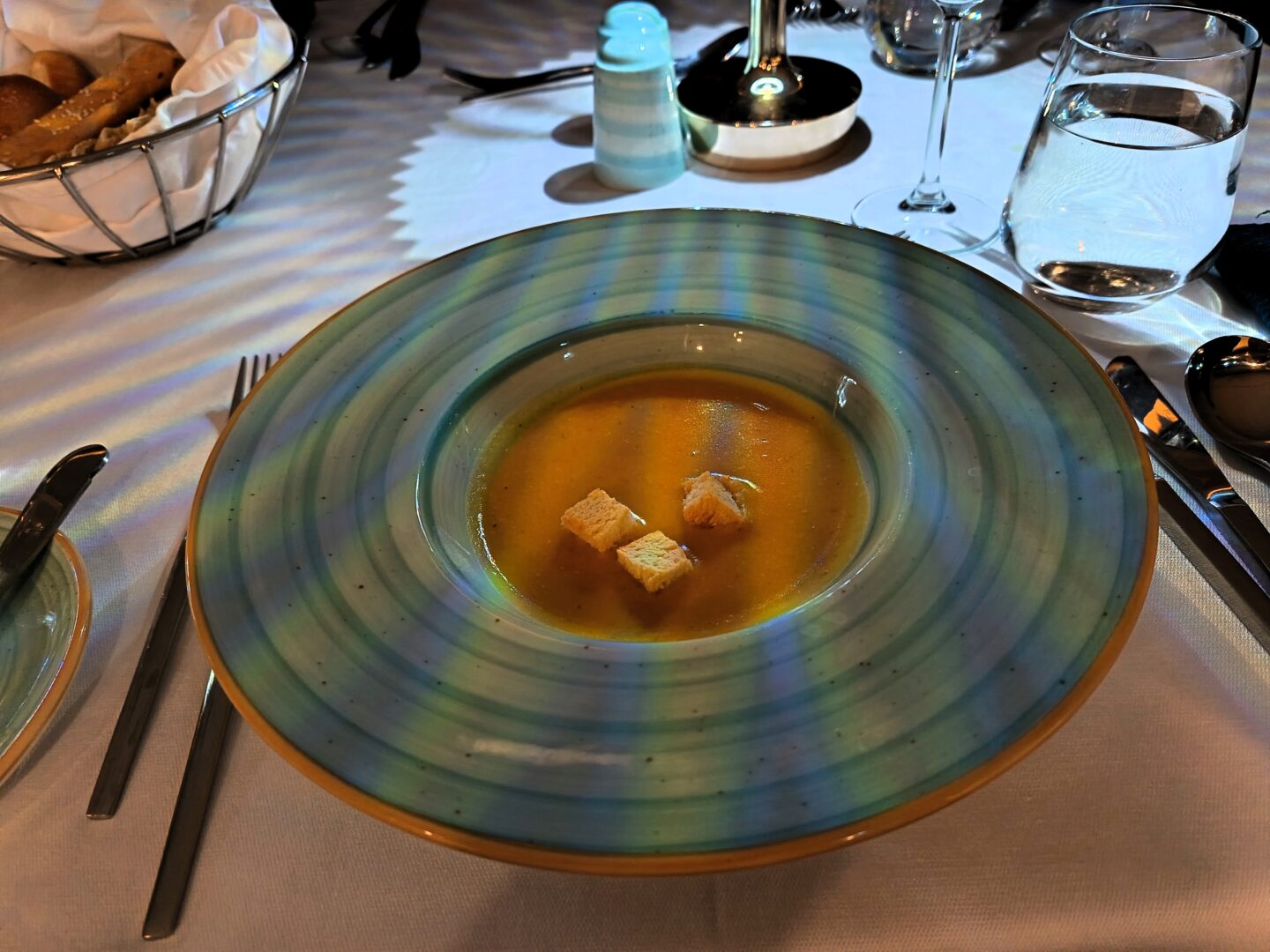 Each day there was a choice of starter, salad, soup, main course, vegetarian option and dessert. Some nights also had the option of a pasta dish, which on one eveneing, I opted to request as a small portion to enjoy as a starter. Requests such as this were always graciously handled and never an issue for the wonderful restaurant team.