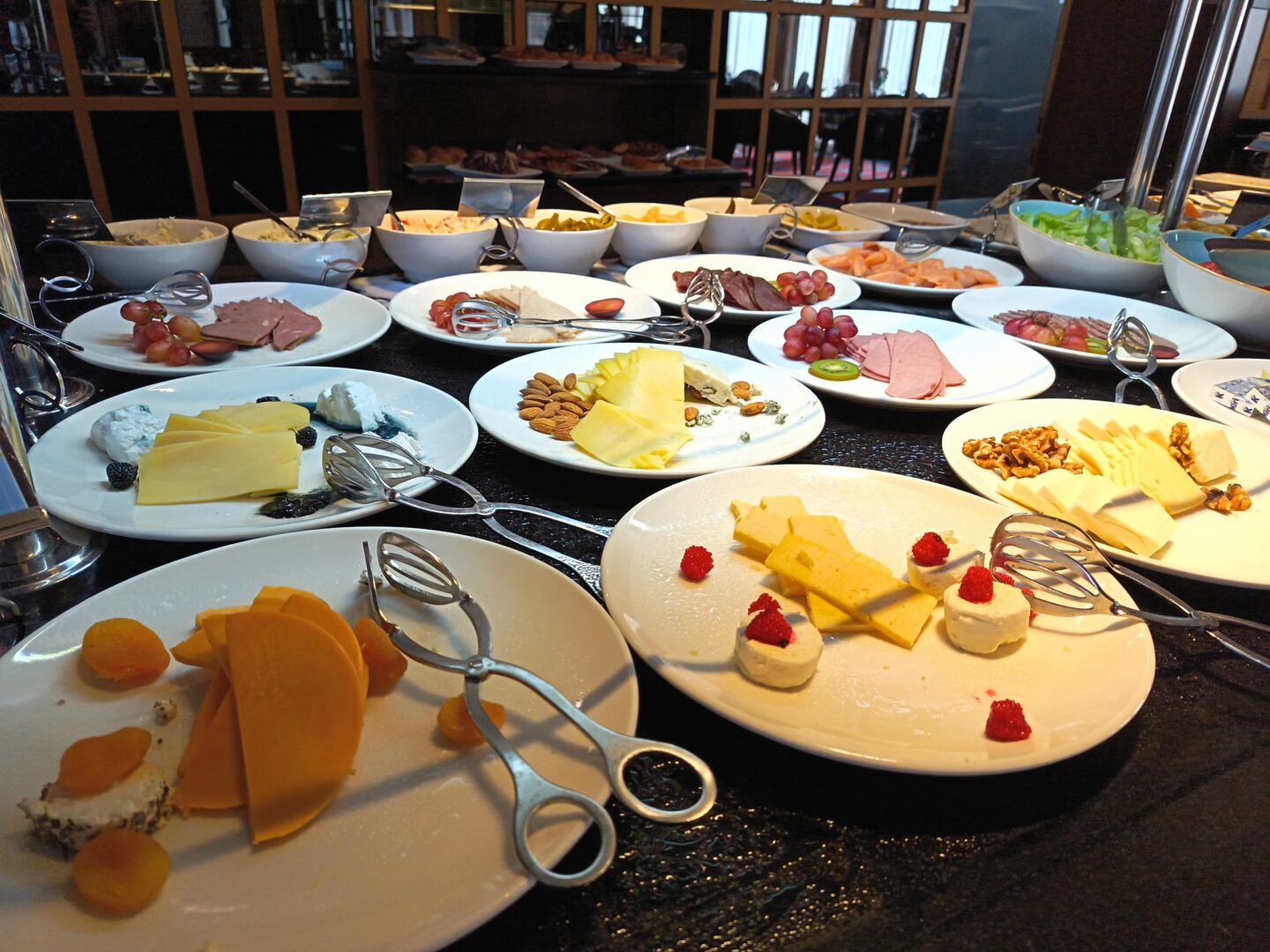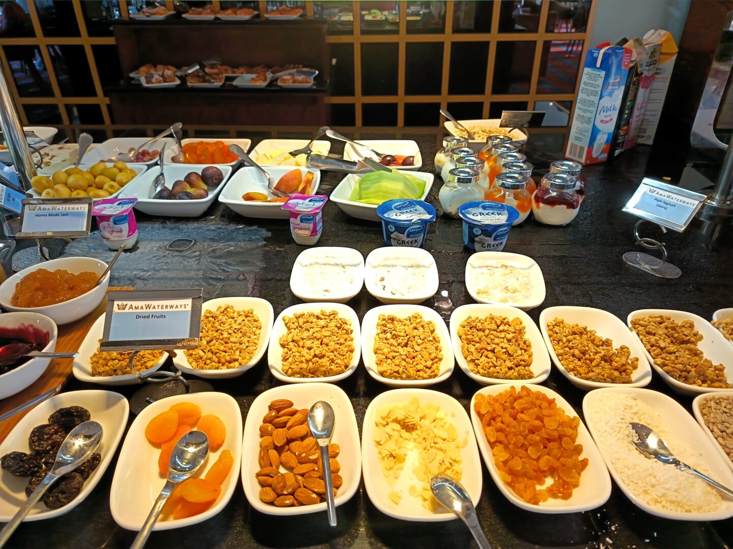 There was a range of cereals, fresh fruits, cheese, cut meats, yoghurts, nuts, breads, preserves and pastries.