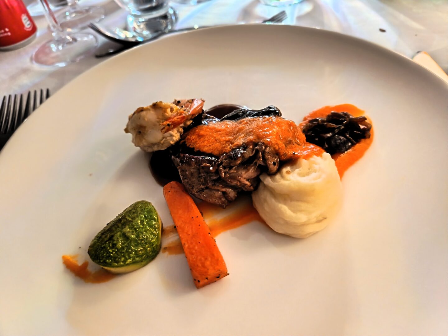 And on our last night, the surf and turf, filet mignon, shrimps and mustard mashed potatoes.