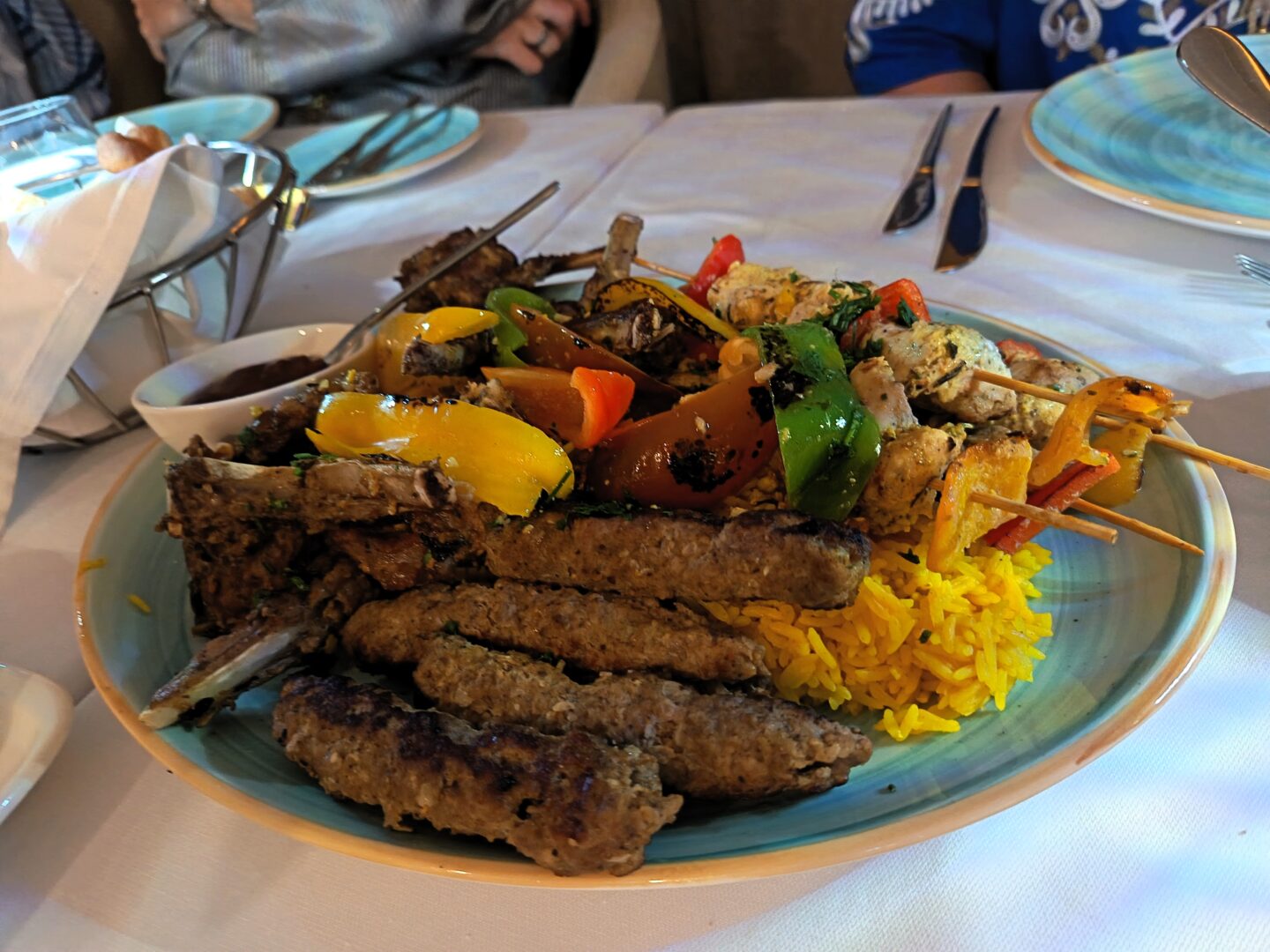 Mains were served family-style, with the centrepiece being the Egyptian mixed grill mashawy, which consisted of grilled lamb, chicken shish tawook (grilled chicken skewers) and beef kofta.